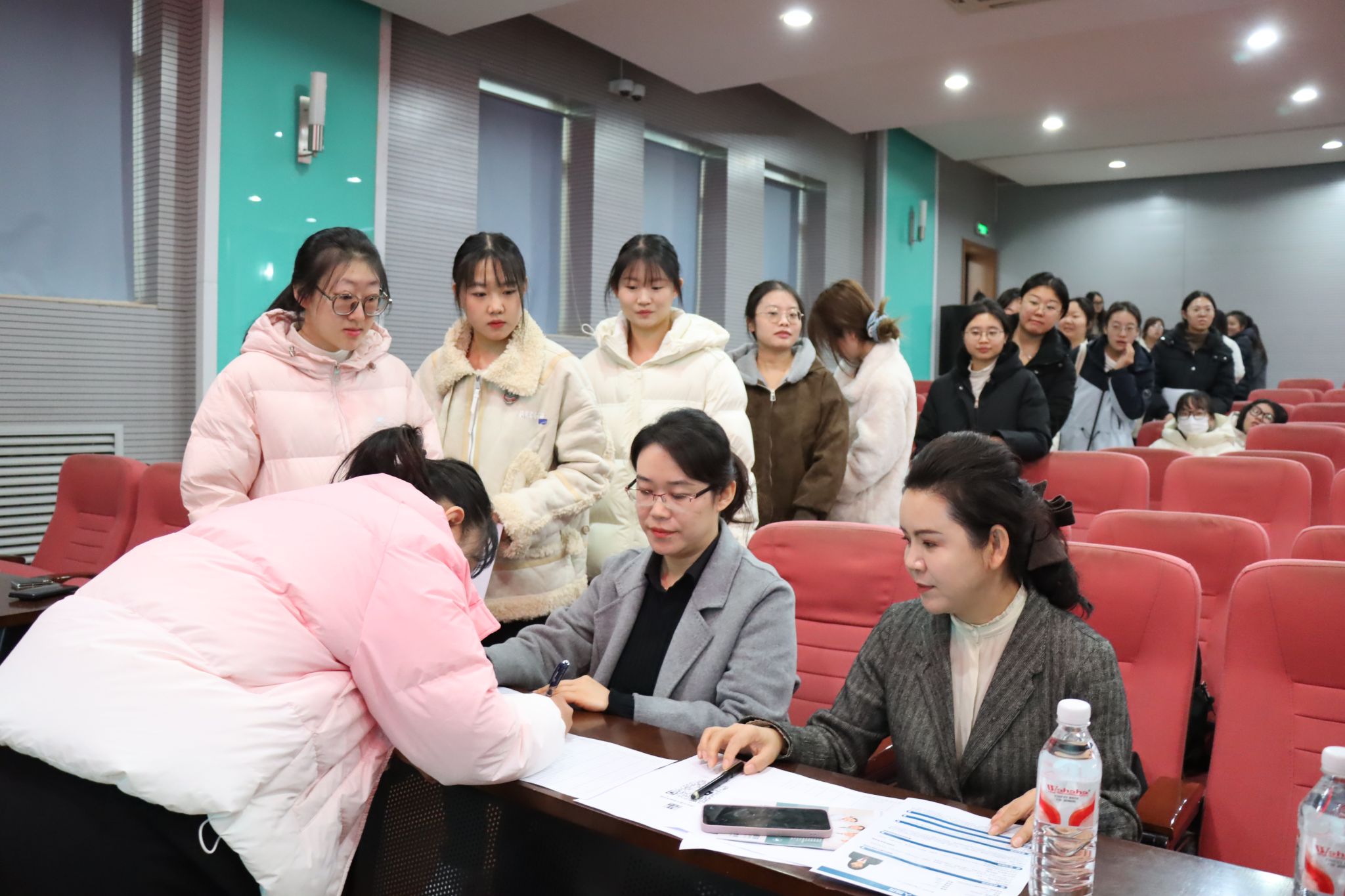 宣讲结束后,有意向的学生携带个人简历、成绩单、资格证书等材料有序排队,与招聘方面对面交流。同学们自信展示专业能力与实践经验,刘雅文主任耐心答疑,现场互动热烈。